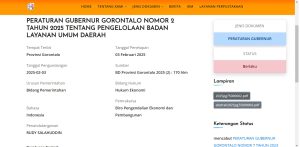 Pemerintah Provinsi Gorontalo telah menetapkan dan mengundangkan Peraturan Gubernur Gorontalo Nomor 2 Tahun 2025 tentang Pengelolaan Badan Layanan Umum Daerah.